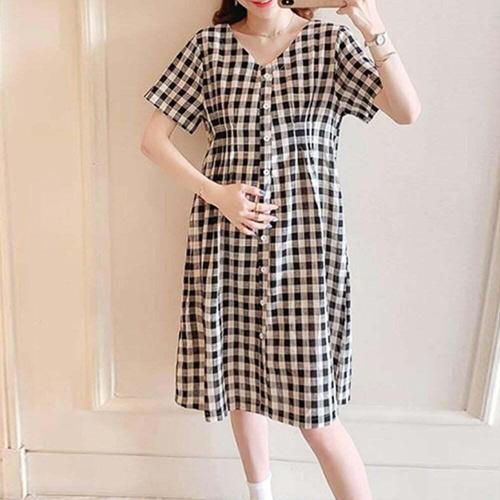[모노무드]모노무드 캐주어 체크원피스 브이넥 여름 단추 반팔 원피스