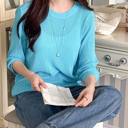 여자 쉬폰 블라우스 셔츠 봄여름 반팔 티 쿨링 상의 봄가을 얇은 7부 라운드넥 니트 BE1
