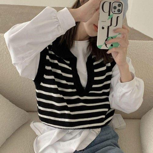 [오너클랜]인기상품 여성용 크롭 스트라이프 니트 조끼 경량 구스 다운 패딩 [WFLL779_260304]