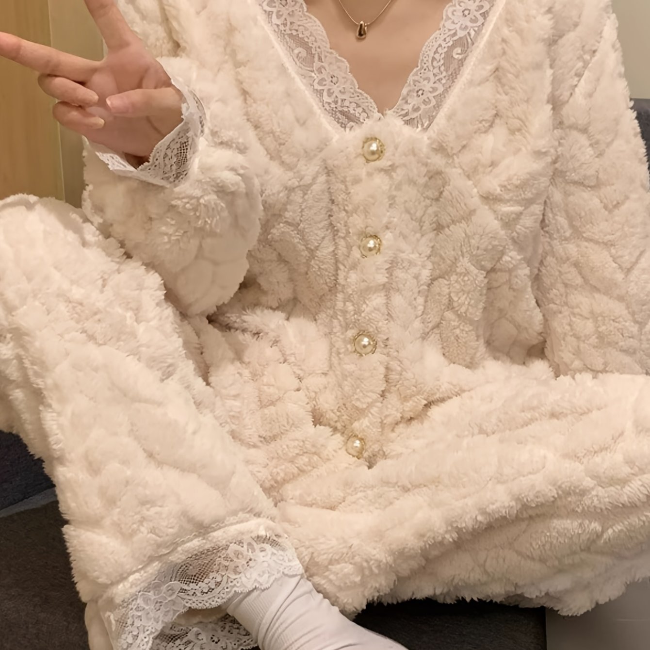 TEMU 여성용 고품질 산호 양털 잠옷, 레이스 스티칭으로 스타일리시하고 달콤한 투피스 홈웨어, 야외복으로 적합, 두꺼운 보온 플란넬 캐주얼 가디건 (긴소매 및 바지)|잠옷|냉장고바지|가디건