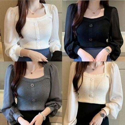 [엄지척]소매 데일리 쉬폰 블라우스 스러운 니트 스퀘어넥 남_19642710_667501