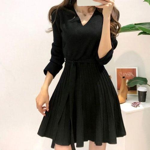 [에이치플러스몰]브이넥 플레어 미니 니트 랩원피스 하객룩 허리스트랩