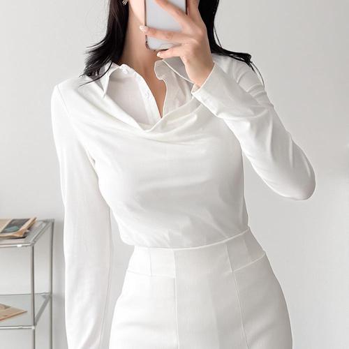 [옷자락]여성 셔츠 레이어드 드레이프 셔링 긴팔 티셔츠