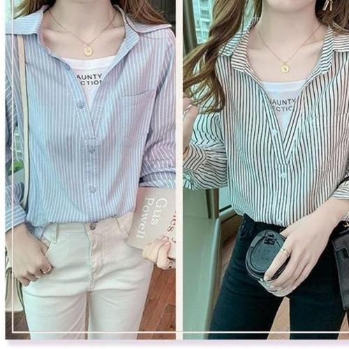 [엄지척]여성 스트라이프 레이어드 남방형 티셔츠 와이드소매_19660953_667501