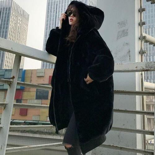 [에이치플러스몰]여성 인조 모피 겨울 롱 후드 집업 털 아우터 블랙