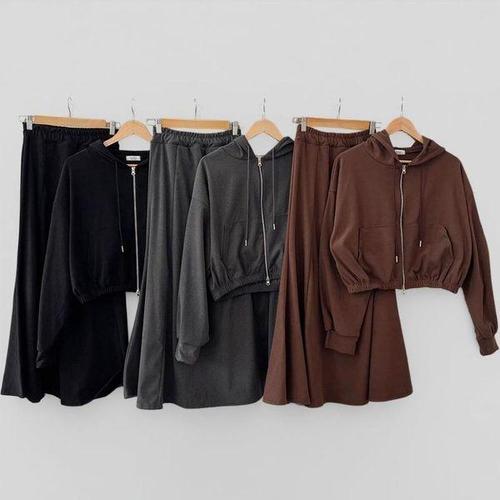 [신상오픈런]여자 크롭 투웨이 포켓 후드집업 플레어 롱스커트 세트