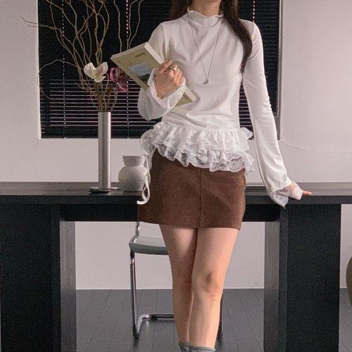 [미라클세븐]여성 레이스 프릴 셔링 발레 스타일 목폴라 골지 티셔츠