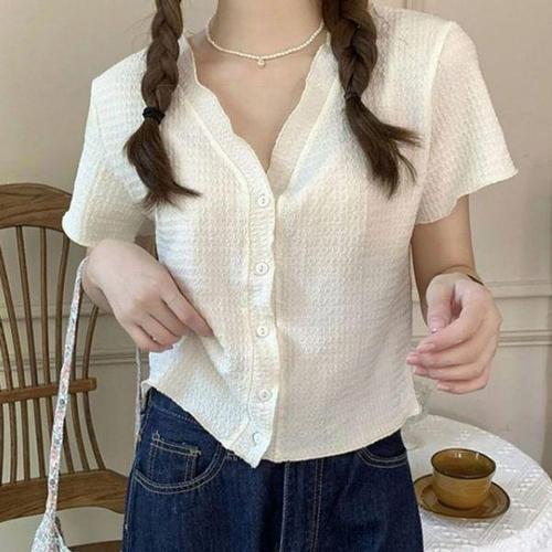 JBHLZXCP 여성 반팔니트 여름 반팔 가디건 라운드넥 퍼프소매 니트반팔 얇은 니트탑 예쁜 진주 단추 니트 티셔츠