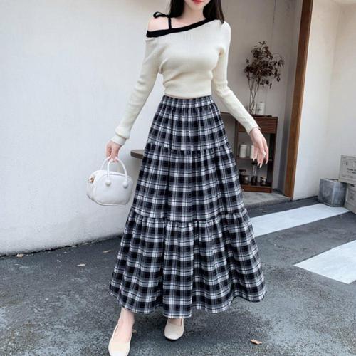 [다잇템]여자 에이라인 허리밴드 격자 패턴 롱스커트