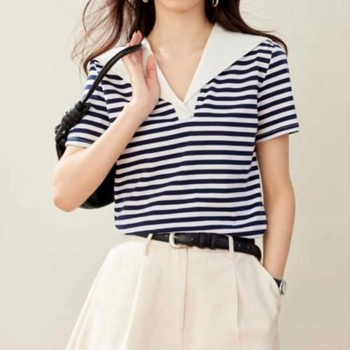 [옷자락]여자 스트라이프 트임 카라 브이넥 반팔 티셔츠