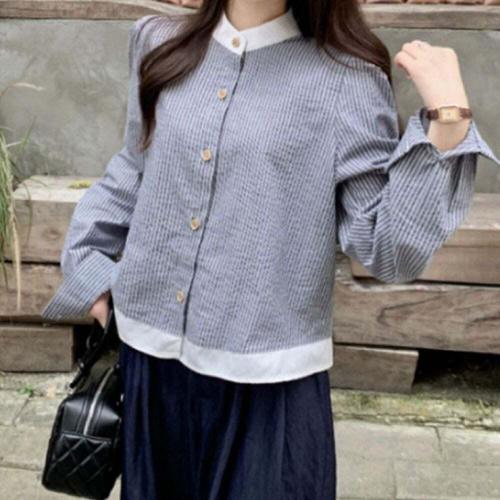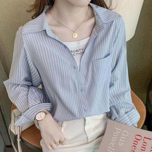 여성용 가을 긴팔 톱 스트라이프 칼라 셔츠 DUCHI3