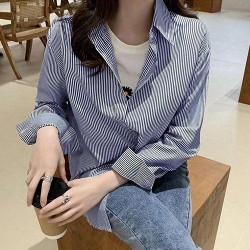 여성용 스트라이프 셔츠 봄가을 긴팔 오피스 캐주얼 이너 룩 상의 KS3