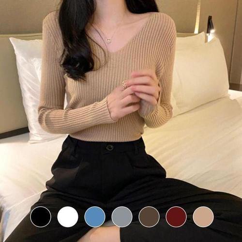 [셀러허브_여성트랜드패션]ONM 베이직 브이넥 긴팔 니트 티셔츠 골지 쫄티 가