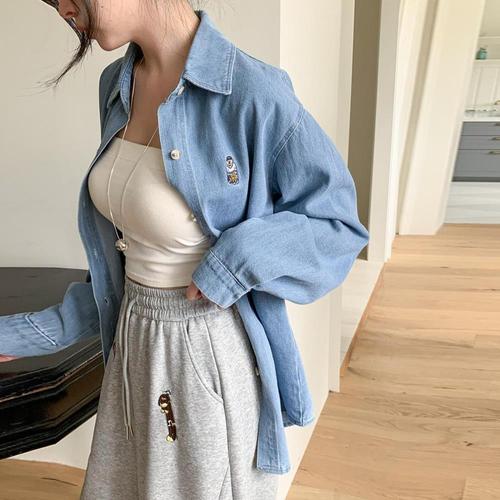 |CHH42B6|여성 봄철 간절기 루즈핏 곰 자수 청 셔츠