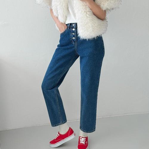 [옷자락] 여성 버튼 기모 겨울 일자핏 진청색 비스판 청바지