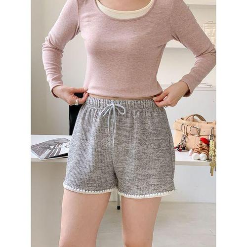 [하젤]상큼 배색 자수 밴딩 골지 니트 반바지_S4612