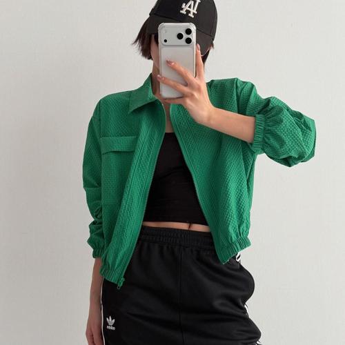 여자 초록색 봄아우터 포켓 카라넥 밴딩 나일론 점퍼