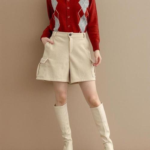 여성 겨울 반바지 5부 울 기모 스판 정장 허리 뒷밴딩 버뮤다 팬츠 여자 모직 반바지 빅사이즈