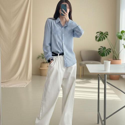 트라이프 줄무늬 카라 여성 긴팔 셔츠