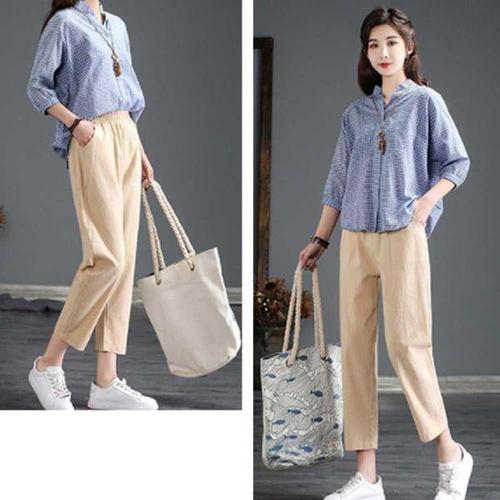 여성 여름 캐주얼 루즈핏 하렘 팬츠 밴딩 허리 코튼 린넨 나인부 바지