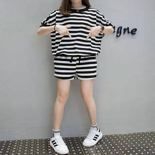 [에이치플러스몰]여성 여름 스트라이프 트레이닝 반팔반바지 셋업