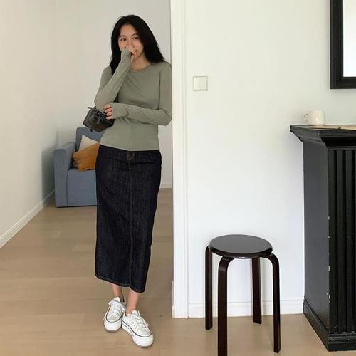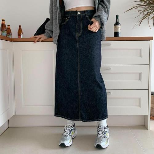 데님 포켓 H라인 데일리 트임 롱 스커트 (DO1WH001A)
