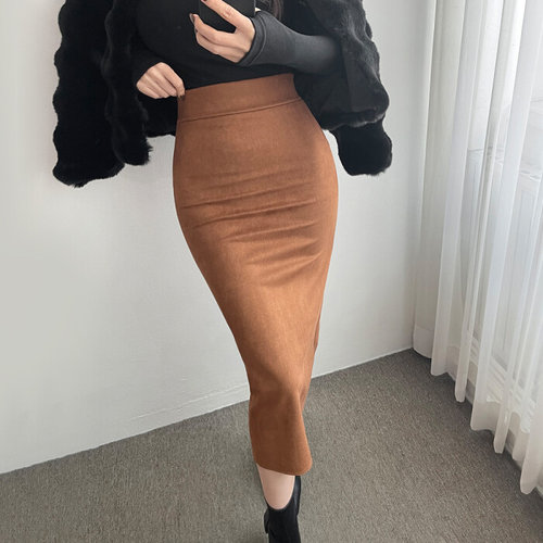 글램핏 / 스웨이드 h라인 베이직 밴딩 슬림핏 뒷트임 롱 스커트
