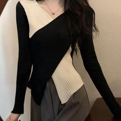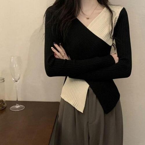 [끌레아]배색 넥라인 크롭한 기장 긴팔티 가을 니트 여성상의 겨울 여자상의 브이넥