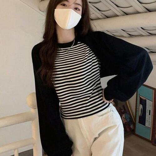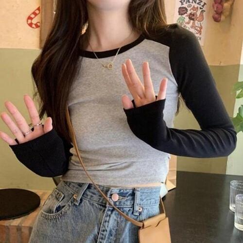 [끌레아]여성 트렌디한 캐주얼 배색 크롭 데일리 긴팔 티셔츠 여성상의 여자상의 겨울 브이넥