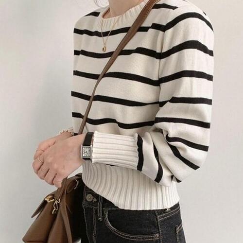 [끌레아]여성 스트라이프 소매 단추 골지 니트 목 폴라 티셔츠 여성상의 여자상의 맨투맨 긴팔