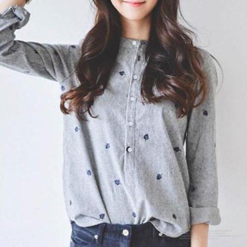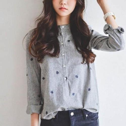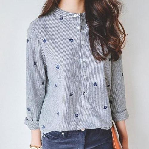 여성 독특한 잎무늬 자수 차이나카라 스트라이프 셔츠