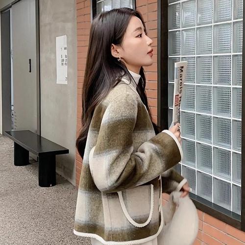 해피유통 여성 추동 코트 하프풍 후드 체크 모직 코트jhz