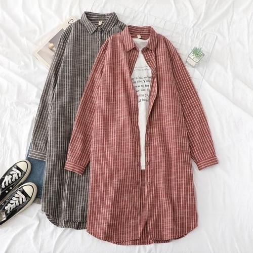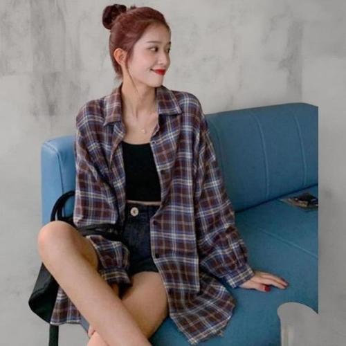 봄 여성 체크 롱셔츠 루즈핏 데일리 빈티지 긴팔 셔츠 캐주얼 베이직 롱가디건 상의 카라넥 패션 오버핏 3컬러