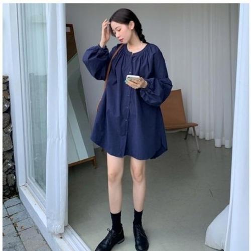 [엄지척]베이지 루즈핏 셔츠 네이비 롱셔츠 셔링_19659287_667501