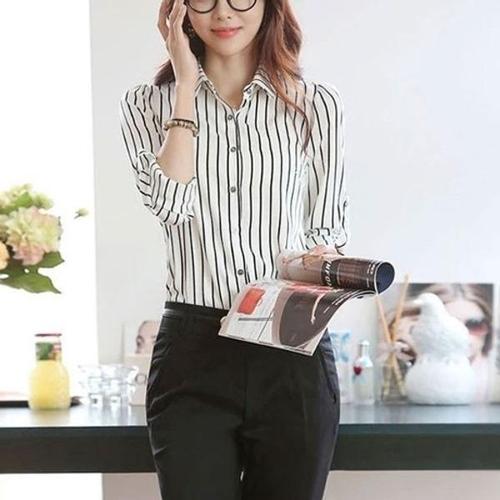 [엄지척]여성셔츠 LK 셔츠 스트라이프 5부 카라 반오픈 롱셔츠_19652156_667501