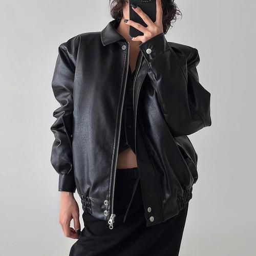 [에이치플러스몰]여성 레더 재킷 카라넥 오버핏 바이크 아우터 가죽자켓