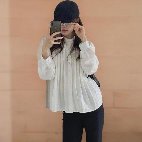 [신상오픈런]여성 핀턱 헨리넥 블라우스 클래식 무지컬러 셔츠