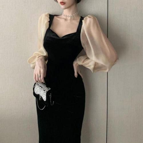 [셀러허브_여성트랜드패션]Rly 여성 클래식 벨벳 시스루 퍼프 파티 드레스 연말