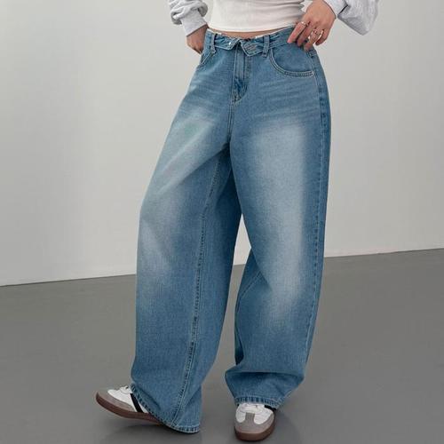[신상오픈런]여성 롤업 로우라이즈 연청색 맥시 와이드핏 워싱 청바지 (45899916)