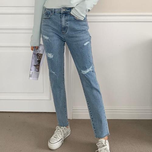 [다잇템]여자 찢청 스판 밑단컷팅 연청 스키니진