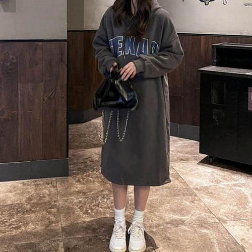 영어로고 포커스 루즈핏 올데이 롱티 후드스웨트 미니드레스