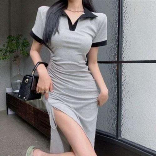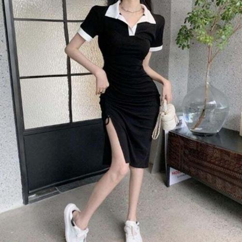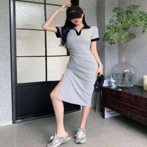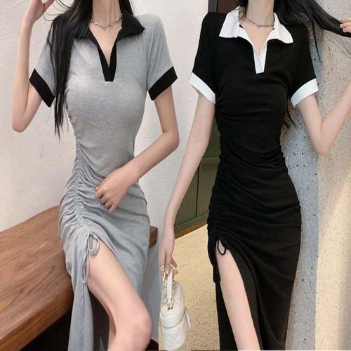반팔원피스 여자 옆트임 셔링 예쁜 롱원피스 카라 배색 캐주얼