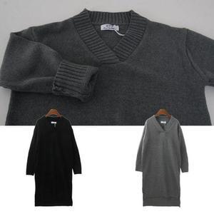 MINA STYLE 브이넥 원피스 니트 롱 옆트임 여성 긴팔 데일리룩