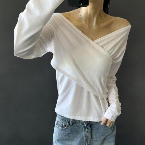 [신상오픈런]여자 레이어드 랩 오프숄더 긴팔 옆트임 크롭 티셔츠