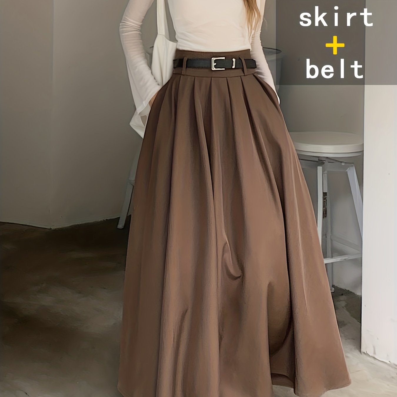 TEMU 여성용 우아한 플리츠 미디 스커트 - 벨트 포함, 하이웨이스트, 흐르는 디자인, 갈색, 사무실 또는 캐주얼한 옷에 완벽, 모든 계절에 착용 가능, 사무실 스커트 | 흐르는 스커트 | 폴리에스터 원단