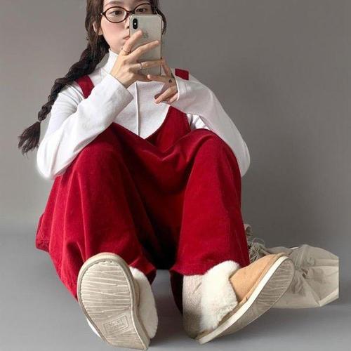 데일리앤 캐런 여성 밍크 융 기모 멜빵 바지 겨울 루즈핏 와이드 점프수트