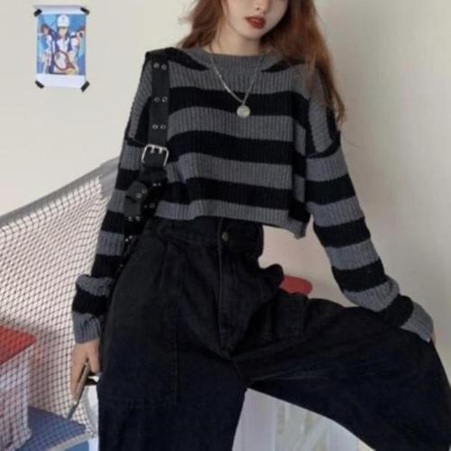 [신상오픈런]여성 오버사이즈 라운드넥 스트라이프 크롭 니트 폴리에스터 (46201816)