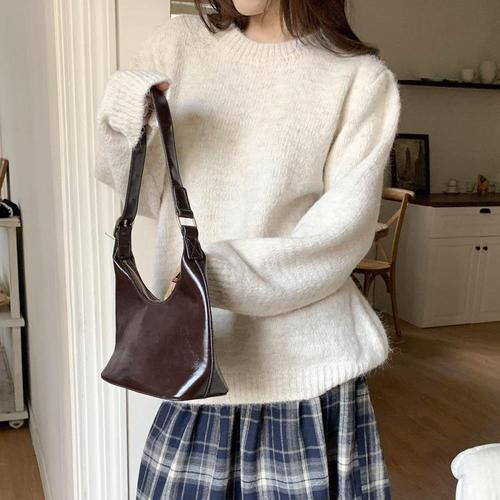 히르시온산 기본 O넥 기본 소매 스웨터 여성용 2025 오버사이즈 숏 니트 울 풀오버 여성 캐주얼 두꺼운 따뜻한 부드러운 탑