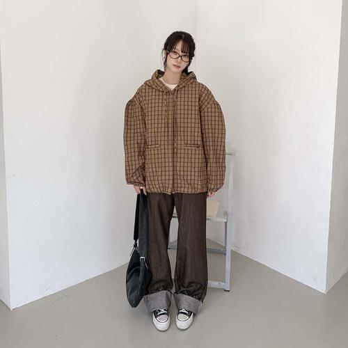 [옷자락]여성 캐주얼 체크 오버핏 스트링 후드 바람막이 점퍼