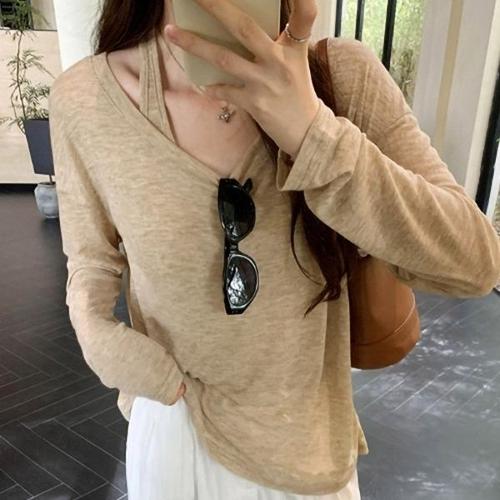 유니픽 여성 봄가을 순면 브이넥 긴팔 티셔츠 디자인감 루즈핏 이중 레이어드zhy